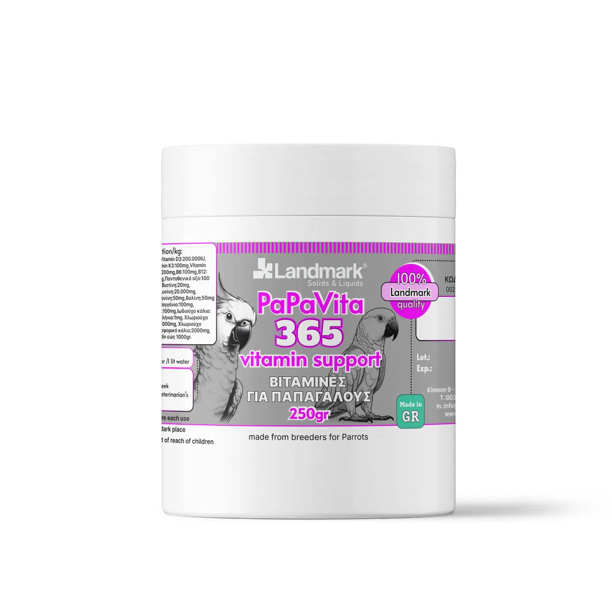 Το PAPAVITA – Βιταμίνες για Παπαγάλους της εταιρίας Landmark, είναι ένα σύγχρονο διατροφικό συμπλήρωμα υψηλής ποιότητας, σχεδιασμένο αποκλειστικά για να καλύπτει τις αυξημένες και εξειδικευμένες ανάγκες των παπαγάλων (μικρών-μεσαίων-μεγάλων. Η υγεία των πτηνών συντροφιάς, η ενέργεια, η ευεξία και η εμφάνισή τους εξαρτώνται σε μεγάλο βαθμό από τη διατροφή τους. Το PAPAVITA – Βιταμίνες για Παπαγάλους προσφέρει μια ολοκληρωμένη λύση υποστήριξης, καλύπτοντας τα διατροφικά κενά που συχνά εμφανίζονται στα κλασικά μείγματα σπόρων και τις συμβατικές τροφές.